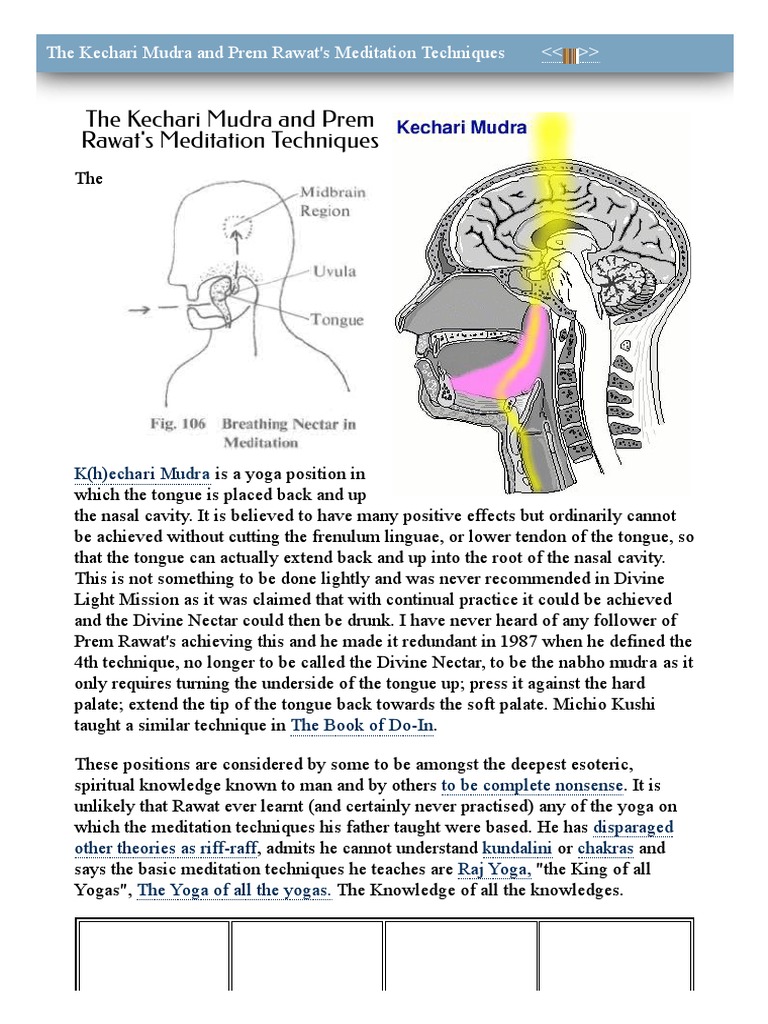 The Kechari Mudra And Prem Rawat S Meditation Techniques - By practicing regularly and for months and years, one can touch his tongue to the uvula and even enter his tongue into the nasal cavity.